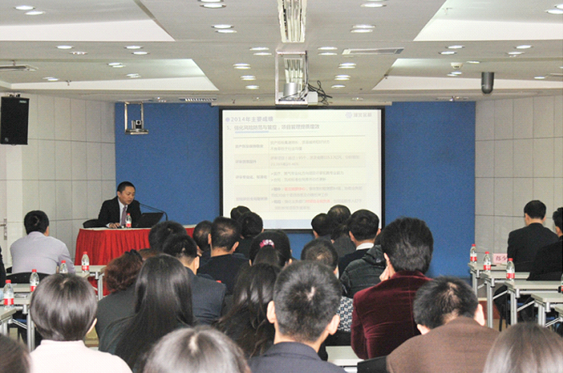 張總裁在會(huì)議上做了2014年年度工作報(bào)告及2015年工作安排,全面客觀地回顧了一年來(lái)公司各項(xiàng)工作進(jìn)展情況,發(fā)現(xiàn)問(wèn)題,總結(jié)得失,并根據(jù)戰(zhàn)略規(guī)劃部署了新一年重點(diǎn)工作任務(wù)。2014年是公司進(jìn)行戰(zhàn)略轉(zhuǎn)型的第一年,在“抓住機(jī)遇、提質(zhì)增效”的指導(dǎo)思想下,圍繞抓好融資結(jié)構(gòu)升級(jí)和風(fēng)控手段創(chuàng)新兩個(gè)著力點(diǎn),加快干部隊(duì)伍建設(shè)梯隊(duì)化和年輕化步伐,構(gòu)建了“業(yè)務(wù)行業(yè)化、融資多元化、風(fēng)控專(zhuān)業(yè)化”的經(jīng)營(yíng)新格局。