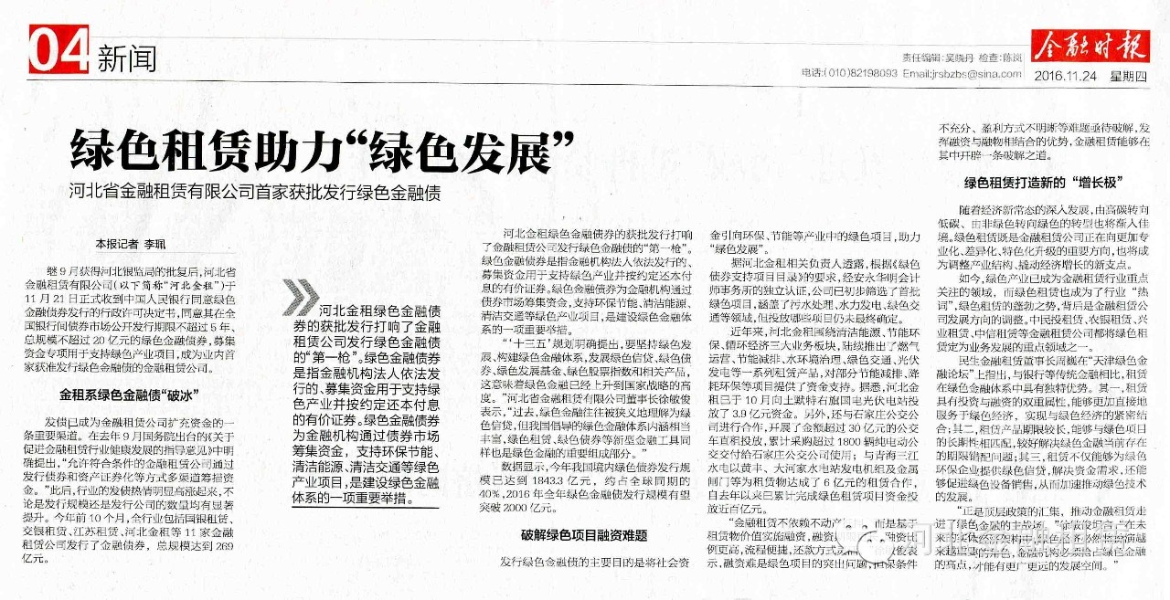 繼9月獲得河北銀監(jiān)局的批復(fù)后,河北省金融租賃有限公司(以下簡稱“河北金租”)于11月21日正式收到中國人民銀行同意綠色金融債券發(fā)行的行政許可決定書,同意其在全國銀行間債券市場(chǎng)公開發(fā)行期限不超過5年、總規(guī)模不超過20億元的綠色金融債券,募集資金專項(xiàng)用于支持綠色產(chǎn)業(yè)項(xiàng)目,成為業(yè)內(nèi)首家獲準(zhǔn)發(fā)行綠色金融債的金融租賃公司。
