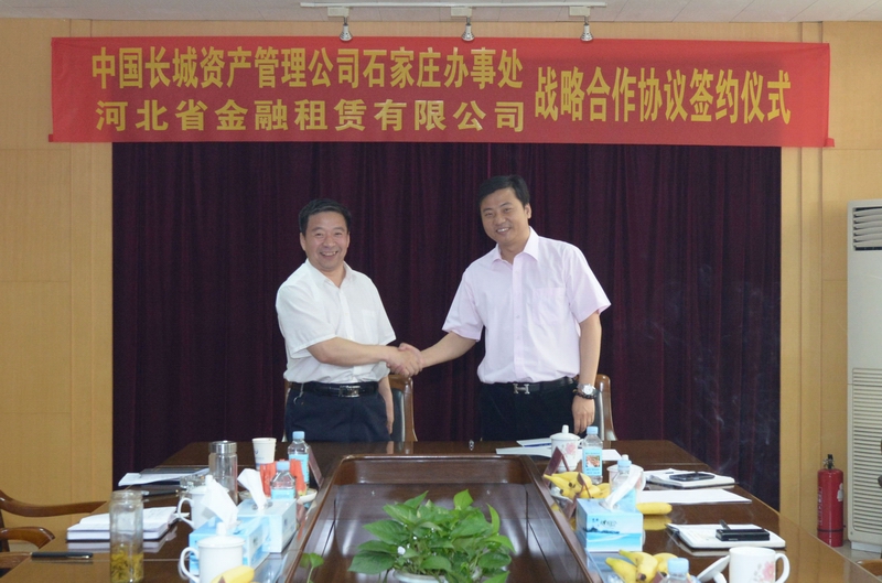 2013年5月31日,為推動各領域業(yè)務合作,促進雙方共同發(fā)展,中國長城資產管理公司石家莊辦事處總經理齊銀庚一行與公司總裁徐敏俊及各位領導進行了戰(zhàn)略合作洽談會。在會上,雙方領導本著平等互利、優(yōu)勢互補、資源共享的原則友好協(xié)商,決定建立全面業(yè)務合作關系。并就風險控制、客戶拓展、資產業(yè)務等方面進行了廣泛的交流,對彼此未來的合作前景和方向深入地交換了意見。雙方將依托各自的行業(yè)特點和業(yè)務范圍,在資產管理、信托業(yè)務、金融租賃、融資業(yè)務等方面進行全面合作。努力實現優(yōu)勢互補、大力促進協(xié)同發(fā)展。當天雙方正式簽署了《戰(zhàn)略合作協(xié)議》,確立了合作關系。